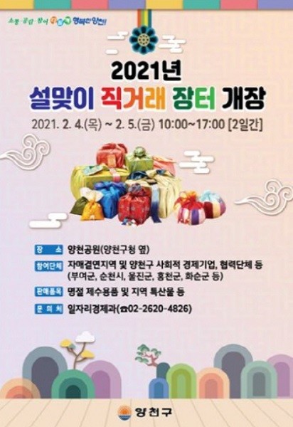 [열린의정뉴스 = 김진성 기자] 서울 양천구(구청장 김수영)는 '설맞이 직거래 장터'를 4일부터 오는 5일까지 이틀간 양천공원에서 운영한다.