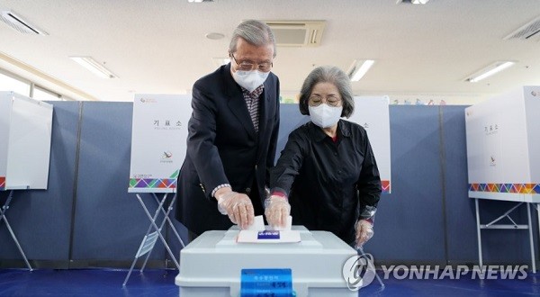 ▲ 김종인 국민의힘 비상대책위원장과 부인 김미경 명예교수가 7일 투표하고 있다[출처=연합뉴스]