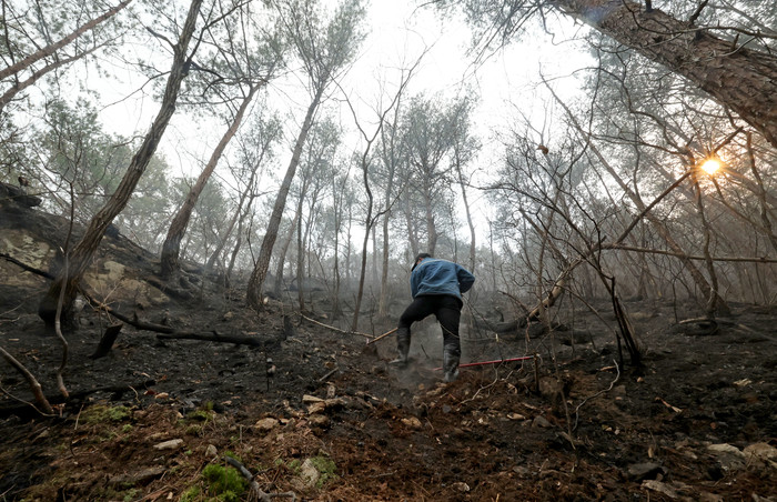 | ▲ 울진·삼척산불이 계속되는 7일 경북 울진군 북면 덕구리에서 울진군 관계자들이 잔불을 정리하고 있다. 2022.3.7 |