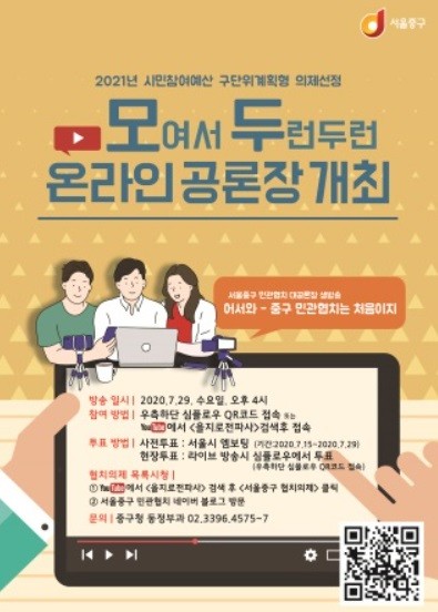 [열린의정뉴스 = 김진성 기자] 서울 중구(구청장 서양호)가 29일 오후 4시 중구 공식 유튜브 채널 '을지로전파사'에서 2021년 시민참여예산 구 단위계획형 의제를 선정하기 위한 온라인 생방송 '모여서 두런두런 공론장'을 개최한다.