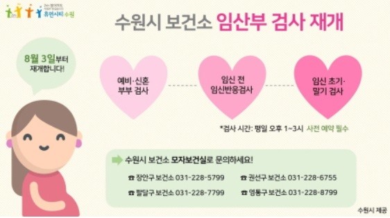 수원시는 8월 3일부터 장안구·권선구·팔달구·영통구보건소에서 임산부 관련 검사 업무 3가지를 재개하기로 결정했다.
