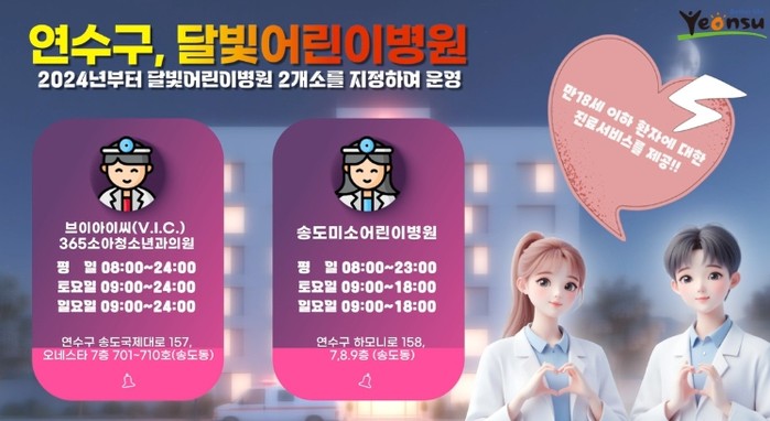 작년 4월 연수구 최초로 지정된 병원인 ‘브이아이씨(V.I.C) 365소아청소년과의원’에 이어 송도동 소재 ‘송도미소어린이병원(최영빈 원장)’을 추가로 지정해 달빛어린이병원은 총 2곳이 운영되고 있다.