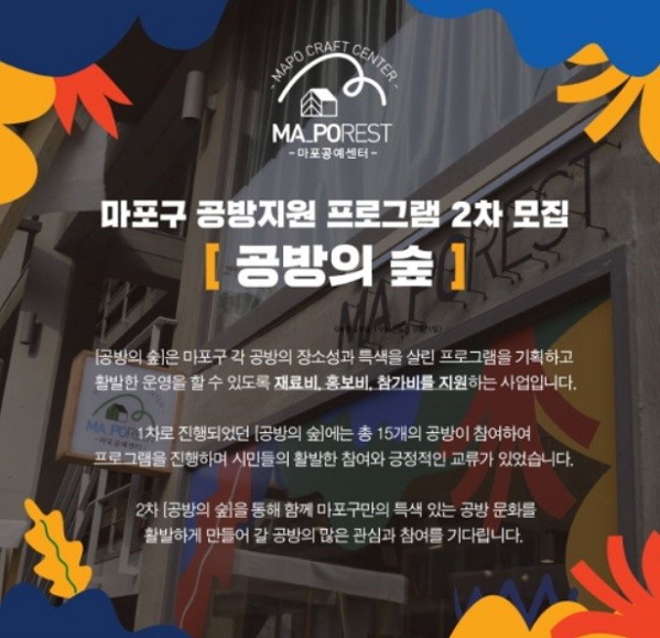 [열린의정뉴스 = 김진성 기자] 서울 마포구(구청장 유동균)는 지역 내 공방을 대상으로 사업비를 지원해 신종 코로나바이러스 감염증(코로나19)으로 위축된 소비심리 회복 및 공방 활성화에 기여하는 '공방 프로그램 지원사업 '공방의 숲''의 참여자를 오는 9일까지 모집한다고 밝혔다.