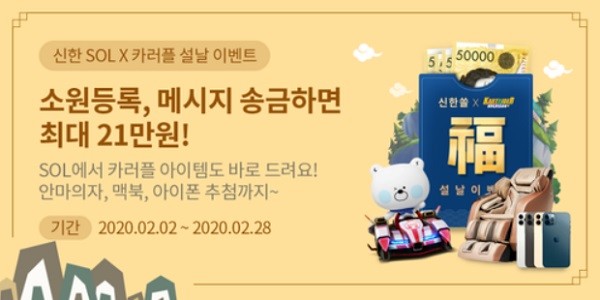 [열린의정뉴스 = 김윤영 기자] 신한은행은 민족 최대의 명절 설을 맞아 ‘신한 쏠(SOL) X 카러플(카트라이더 러쉬플러스) 설날 이벤트’를 시행한다고 3일 밝혔다.