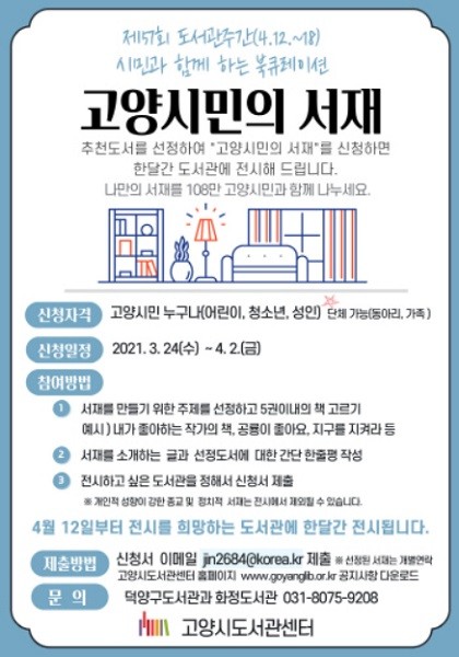 이번 '고양시민의 서재' 신청은 내달 2일까지 이메일(jin2684@korea.kr)로 접수하면 된다.