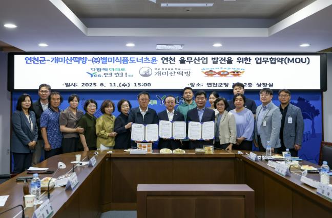 [코리아 이슈저널=홍춘표 기자] 연천군은 11일 군청 상황실에서 ㈜별미식품도너츠윤, 개미산떡방과 함께 ‘연천율무 산업발전을 위한 업무협약(MOU)’을 체결했다고 밝혔다.