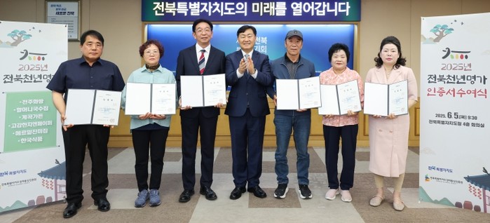 [코리아 이슈저널=김종오 기자] 전북특별자치도는 5일 오랜 시간 한 자리를 지켜온 도내 대표 소상공인 6개사를 ‘2025년 전북천년명가’로 신규 지정하고, 인증서 수여식을 개최했다. 도는 ‘30년을 넘어 100년으로’라는 가치 아래, 전통과 혁신을 겸비한 소상공인을 발굴해 전북 경제의 근간으로 성장시킬 계획이다.