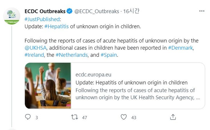 유럽질병통제예방센터(ECDC)는 이날 환자 수는 밝히지 않은 채 원인 불명 어린이 간염 환자가 영국 외에 덴마크와 스페인, 아일랜드, 네덜란드 등 유럽 4개국에서 도 확인됐다고 밝혔다.