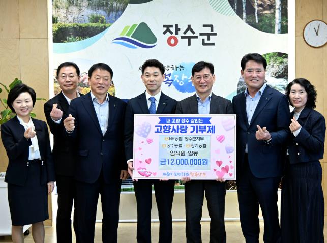 [코리아 이슈저널=김종오 기자] 장수군은 NH농협 장수군지부, 장수농협, 장계농협 등 장수지역 농협 임직원들이 장수군을 사랑하는 마음을 담아 고향사랑기부금 1,200만원을 장수군에 기탁했다고 14일 밝혔다.