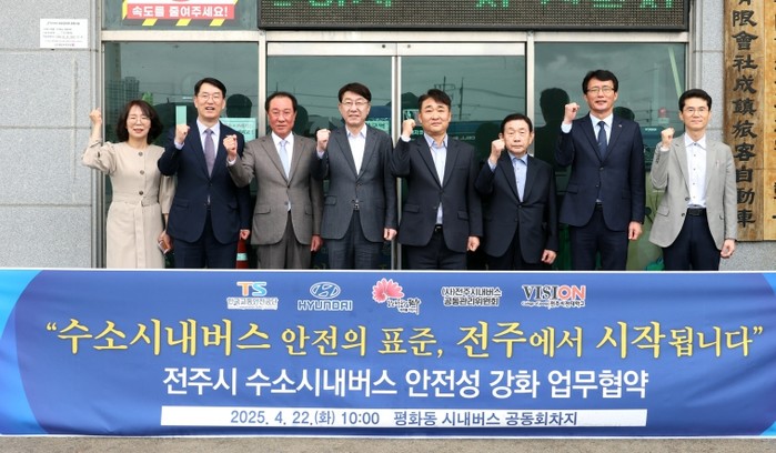시는 22일 평화동 시내버스 회차지에서 현대자동차, 전주시내버스공동관리위원회, 전주비전대학교, 한국교통안전공단과 ‘수소시내버스 안전성 확보를 위한 업무협약(MOU)’을 체결했다.