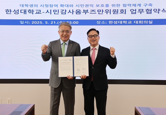 [코리아 이슈저널=최준석 기자] 서울시 시민감사옴부즈만위원회는 21일 오후 3시, 청년층의 시정 참여 확대 및 시민권익 보호를 위한 상호 협력체계를 구축하기 위해 한성대학교와 업무협약(MOU)을 체결했다고 밝혔다.
