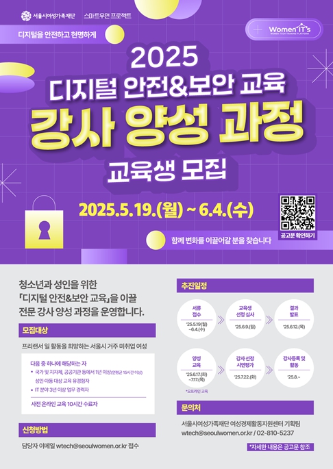 [코리아 이슈저널=최준석 기자] 서울시여성가족재단이 ‘디지털 안전&보안 교육 전문가 양성 과정’에 참여할 교육생을 모집한다.