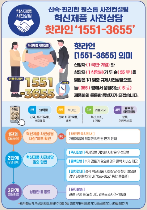 혁신제품 개발기업과 개발자가 혁신제품 사전상담 핫라인을 통해 의약품, 바이오의약품, 의료기기, 융복합의료제품 등 상담분야를 선택하면 전문 상담자와 신속하게 연결되도록 하여 복잡한 ARS 절차를 최소화해 사용자의 이용 편의성을 높였다. 핫라인 상담 시간은 평일 오전 9시부터 오후 17:30까지이다.