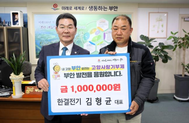 [코리아 이슈저널=김종오 기자] 부안군 행안면에서 한결전기를 운영 중인 김형균 대표가 지난 25일, 부안군에 고향사랑기부금 100만 원을 기탁했다.