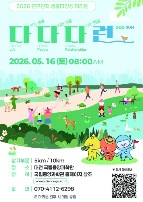 [코리아 이슈저널=최용달 기자] 과학기술정보통신부 국립중앙과학관은 생물다양성의 소중함을 온몸으로 체감하고 일상 속 친환경 실천 문화를 확산하기 위한 2026 연구단지 생물다양성 마라톤 ‘다다다런(다양한 생물, 다양한 사람, 다양한 연결)’을 개최한다고 밝혔다.