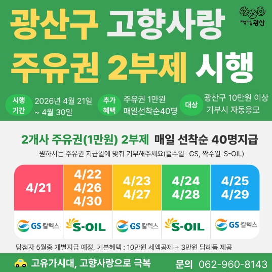 [코리아 이슈저널=김종오 기자] 광산구는 지속적인 고향사랑기부 참여를 확대하고 기부자에게 추가 혜택을 제공하기 위해 ‘주유권 2부제 행사’를 마련했다.