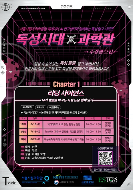 [코리아 이슈저널=최준석 기자] 서울시립과학관은 서울시립대학교 화학물질 빅데이터 AI 연구센터와 협력해 환경 속 유해 화학물질에 대한 과학적 이해를 돕는 프로그램 ‘독성시대 인(IN) 과학관’을 6월 14일부터 7월 19일까지 운영한다고 밝혔다.
