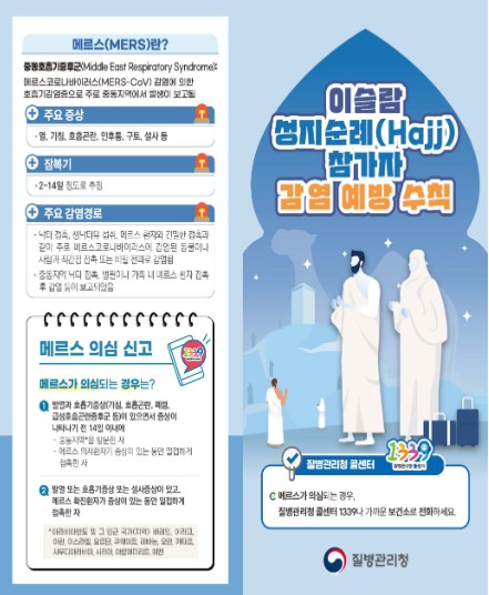 [코리아 이슈저널=김윤영 기자] 질병관리청은 이슬람 성지순례(하지, Hajj, 2026년 5월 25일~5월 30일 변동 가능) 시기를 맞아 사우디아라비아 방문객들에게 중동호흡기증후군(Middle East Respiratory Syndrome, 메르스) 및 수막구균 감염증(Meningococcal disease)을 주의할 것을 당부했다.