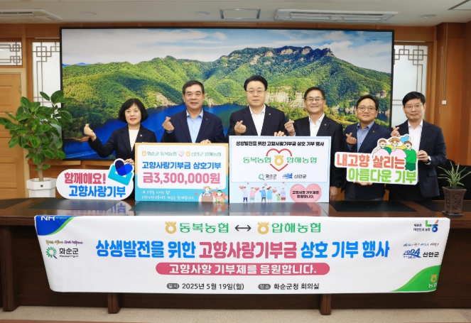 [코리아 이슈저널=김종오 기자] 화순군은 지난 19일 동복농협(조합장 김정수)과 신안 압해농협(조합장 천성태)이 화순군청을 방문해 고향사랑기부금 상호기부 기탁식을 통해 지역 간 상생발전을 위한 협력 체계 구축에 나섰다고 밝혔다.