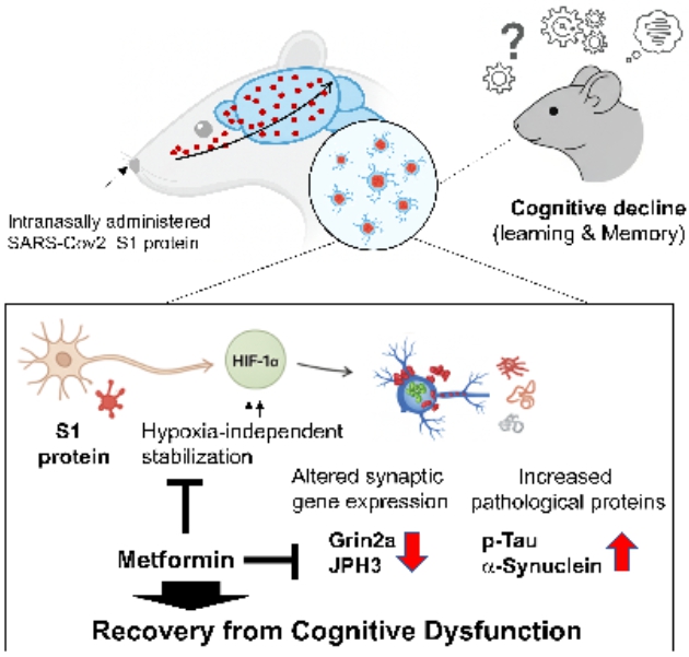 실험에서 쥐에게 S1 단백질을 비강으로 투여한 결과, 숨겨진 플랫폼을 찾는 시간이 길어지는 등 학습·기억 능력이 감소하고 낯선 공간에서 불안 행동이 증가하여 코로나19 감염 후 나타나는 인지저하와 유사한 양상이 관찰됐다.또한, 투여 6주 후 뇌(해마)에서는 신경세포 수 감소와 함께 퇴행성 뇌질환에서 나타나는 병리 단백질 축적이 확인되어, 장기적인 뇌손상 가능성이 제기됐다.