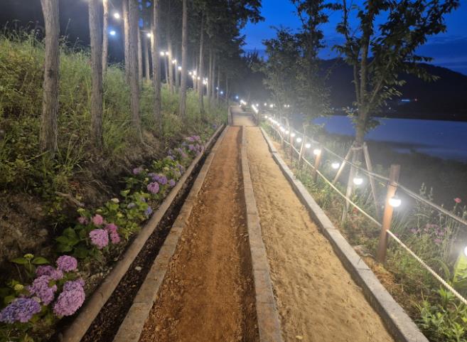 해당 사업은 걷기 좋은 공원 환경을 조성하고 군민의 건강 증진과 심리적 안정을 도모하기 위해 추진됐으며, 형형색색 수국의 향기를 따라 걷는 맨발로 걷는 길(어싱길)에는 조명 시설도 함께 설치돼 야간에도 안전하게 산책을 즐길 수 있다.