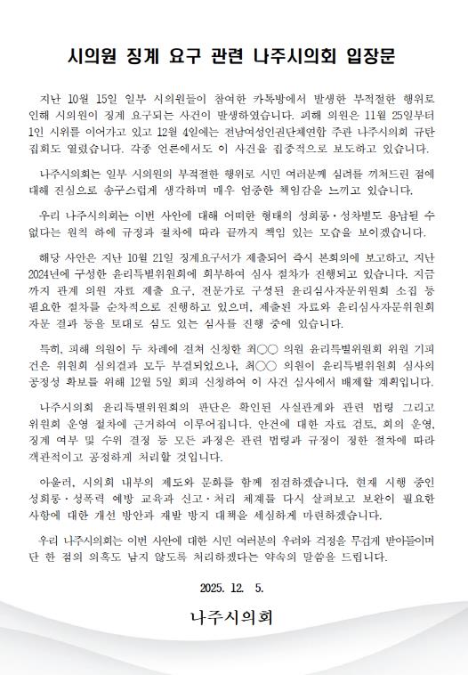 [코리아 이슈저널=홍춘표 기자] 나주시의회는 지난 10월 15일 일부 시의원들이 참여한 카카오톡 대화방에서 발생한 부적절한 행위로 징계 요구가 제기되고, 피해 의원의 1인 시위와 여성단체 규탄 집회, 언론 보도가 이어진 상황과 관련하여 12월 5일 공식 입장문을 발표했다.