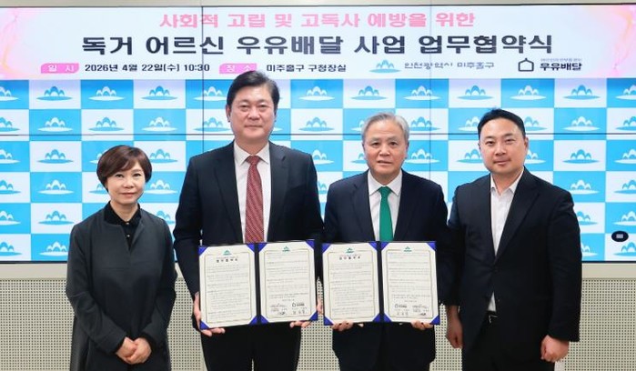[코리아 이슈저널=홍춘표 기자] 인천 미추홀구는 22일 (사)어르신의 안부를 묻는 우유배달과 독거 어르신의 건강한 생활 지원 및 고독사 예방을 위한 ‘어르신의 안부를 묻는 우유배달 사업’ 업무협약을 체결했다.