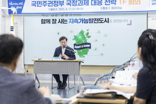 | ▲ 박승원 광명시장이 11일 오전 시청 중회의실에서 열린 ‘국민주권정부 국정과제 대응 전략 TF’ 회의에 참석해 발언하고 있다. |