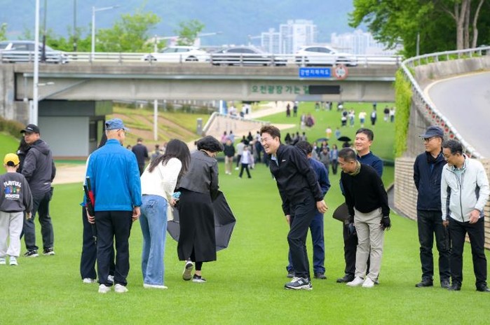 ▲ 노관규 순천시장이 오천그린광장을 방문한 시민들과 인사를 나누고 있다 |