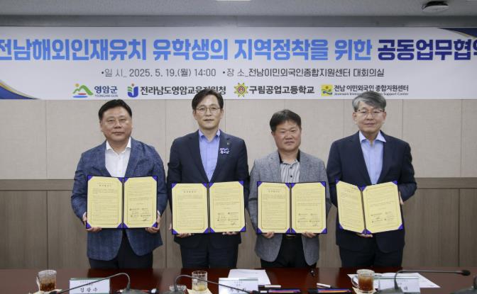 [코리아 이슈저널=김종오 기자] 영암군이 19일 전남이민외국인종합지원센터, 영암교육지원청, 구림공고 등과 센터에서 지역 유학생의 안정 정책 지원을 내용으로 민·관·학 공동업무협약을 체결했다.