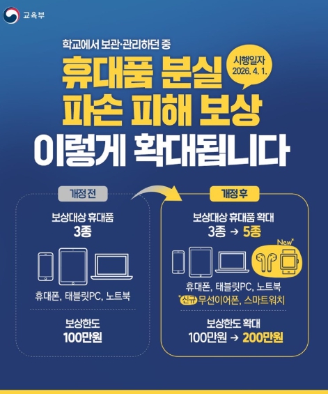 [코리아 이슈저널=최용달 기자] 학교에서 보관·관리하던 중 휴대품 분실·파손 피해 보상 이렇게 확대됩니다.
