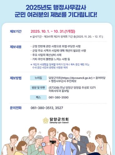[코리아 이슈저널=홍춘표 기자] 담양군의회는 2025년 행정사무감사를 앞두고 ‘행정사무감사 주민제보’ 접수를 첫 시행 한다고 밝혔다.