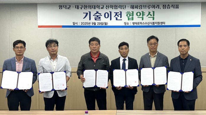 [코리아 이슈저널=김태훈 기자] 영덕군과 로하스수산식품지원센터를 위탁 운영하는 대구한의대학교 산학협력단, 그리고 관내 농산물법인 해파랑브루어리와 수산물업체 정승식품이 지난 29일 산·학·연·관 간 기술이전 협약을 체결했다.