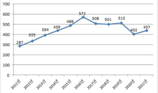 상담 건수는 2019년 513건을 기록했다가 코로나19에 따른 원격수업으로 2020년 402건까지 줄었지만, 대면수업이 활성화되면서 다시 증가했다.