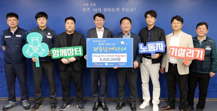 이 자리에서 △NH농협중앙회 노동조합 △전북은행 노동조합 △전주시시설관리공단 노동조합 △휴비스 전주공장 노동조합 △전주시 공무원 노동조합 △전주시 공무직 노동조합 등 한국노총 소속 6개 노동조합은 총 600만 원의 기부금을 모아 시에 전달했다.