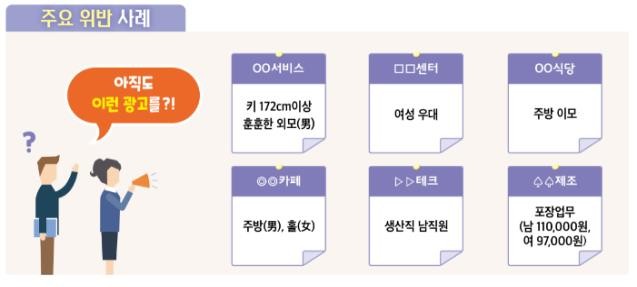 이 중에는 '남자 사원모집'·'여자 모집' 등 특정 성별에만 채용 기회를 주는 경우, '여성 우대'·'남성 우대' 등 합리적인 이유 없이 특정 성별을 우대하는 표현을 사용하는 경우가 많았다.