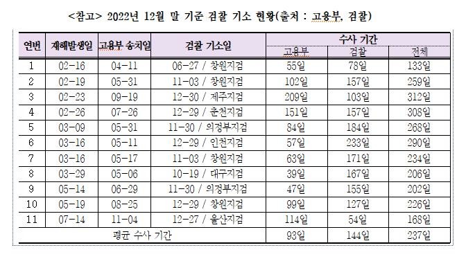 경총에 따르면 작년 12월 말 기준으로 수사기관이 경영 책임자를 중대재해법 위반 혐의로 기소한 사건은 11건, 기소까지 기간은 평균 237일(약 8개월)로 나타났다. 고용노동청은 평균 93일(약 3개월), 사건을 송치받은 검찰은 평균 144일(약 5개월)간 수사를 진행한 것으로 파악됐다.
