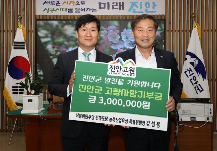 [코리아 이슈저널=김종오 기자] 진안군은 지난 30일, 前 전북도의원이자 현재 더불어민주당 전북도당 농축산업육성 특별위원장으로 활동 중인 강성봉 전 의원이 진안군에 고향사랑기부금 3백만원을 전달했다고 밝혔다.