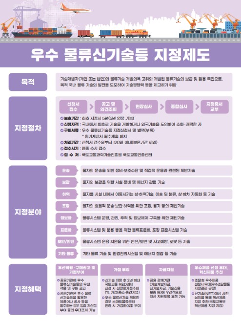 물류신기술 제도는 국내 최초로 개발되거나 외국에서 도입하여 개량한 물류기술을 평가해 △신규성 △진보성 △경제성 △현장적용성 △보급‧활용성이 우수한 기술을 국토교통부 장관이 지정하는 제도다. 물류기술의 보급 및 활용 촉진을 위해 2020년부터 시행됐으며 지금까지 총 9건이 지정됐다.