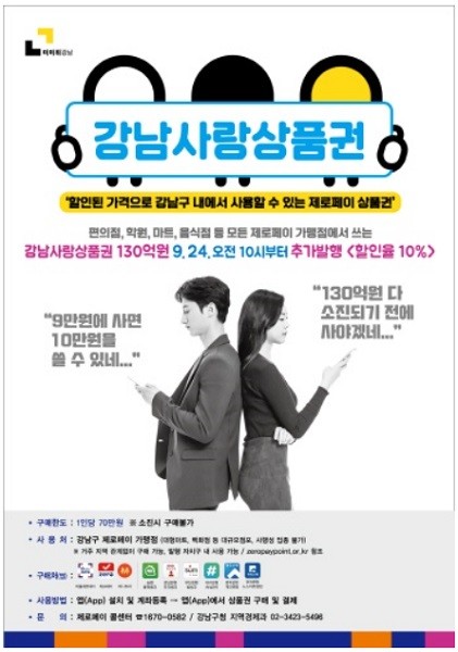 이번 추가 발행되는 강남사랑상품권은 1만 원·5만 원·10만 원권 등 3가지로 구성돼 있으며, 1인당 월 70만 원 한도 내에서 할인된 금액으로 구매할 수 있다.