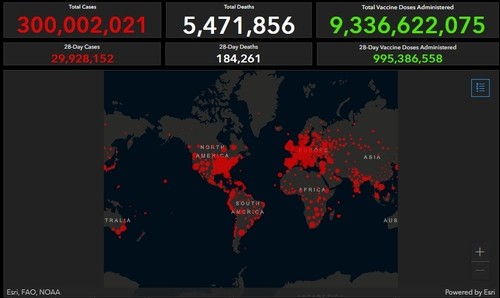 [열린의정뉴스 = 최성일 기자] 미국 존스홉킨스대학은 7일(현지시간) 전세계 신종 코로나바이러스 감염증(코로나19) 확진자 수가 3억명을 돌파했다고 밝혔다.