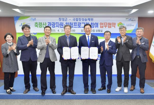 [코리아 이슈저널=김종오 기자] 장성군과 국립장성숲체원이 축령산 체험관광 활성화를 위해 힘을 모으기로 했다. 군과 숲체원은 최근 군청 상황실에서 ‘축령산 관광자원 체험 프로그램 업무협약’을 체결했다. 김한종 장성군수, 정종근 국립장성숲체원장을 비롯한 관계자 10여 명이 참석했다.