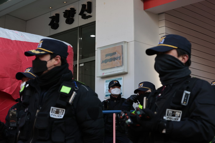 | ▲ 18일 오전 경찰들이 국정원 압수수색이 이루어지고 있는 서울 중구 전국민주노동조합총연맹(민주노총) 서울 사무실 앞 통행을 통제하고 있다. 2023.1.18 |