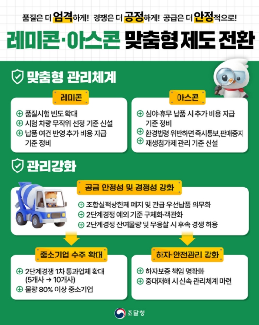 [코리아 이슈저널=최용달 기자] 조달청은 레미콘·아스콘의 물품 특성을 반영한 맞춤형 제도 운영을 위해 관련 규정을 전면 개정하고 2026년 3월 1일부터 시행한다고 밝혔다.