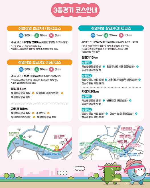 뚝섬한강공원 야외수영장에 수영 200m 초급자 수영존이 운영되며, 수영에 자신 없지만 한강 입수 체험을 위해 수영 300m를 신청한 참가자를 위해서는 튜브로 이동할 수 있는 ‘튜브레인’도 설치된다. 튜브는 행사 당일 현장에서 결정해 이용할 수 있다.