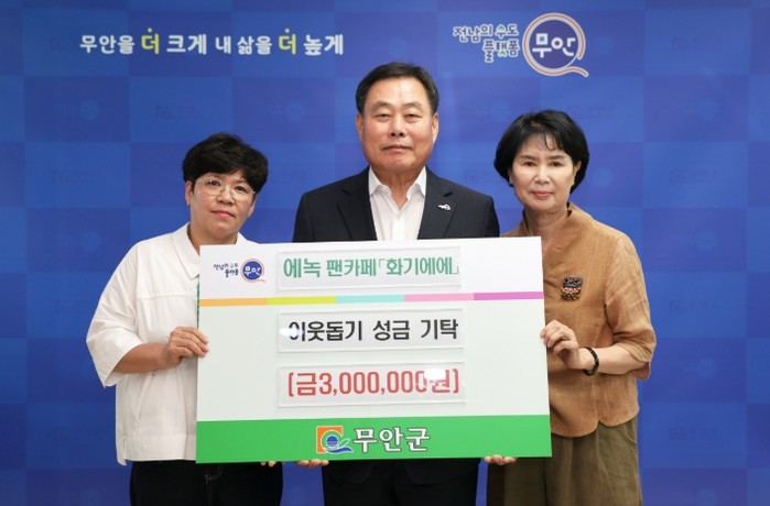 [코리아 이슈저널=김종오 기자] 전남 무안군은 지난 10일 가수 에녹의 공식 팬카페 ‘화기에에’로부터 지역 저소득층 지원을 위한 기부금 300만 원을 기탁받았다.