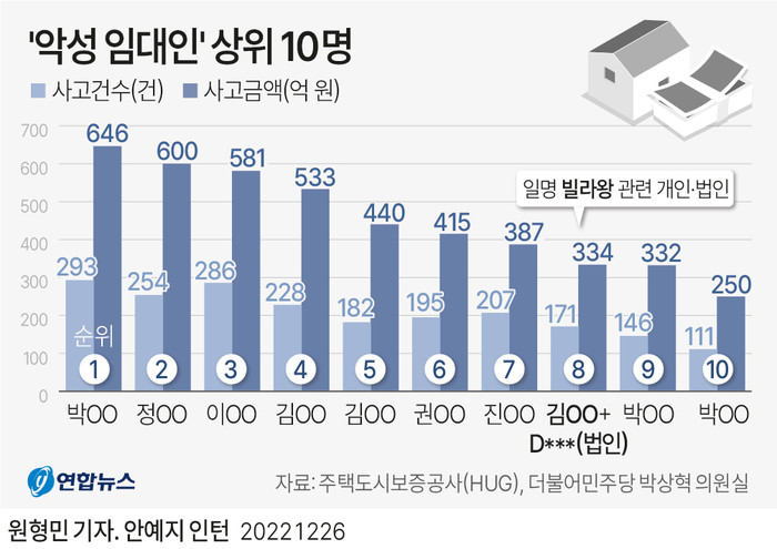 이 같은 정씨 일당의 범죄 피해액(사고금액)은 334억원의 보증사고 금액을 낸 '빌라왕'보다 피해액이 많아, 정씨는 주택도시보증공사(HUG) 측 '악성 임대인' 블랙리스트 상위 10명 중 2위에 이름을 올린 인물(254건·600억원 피해)로 추정된다.