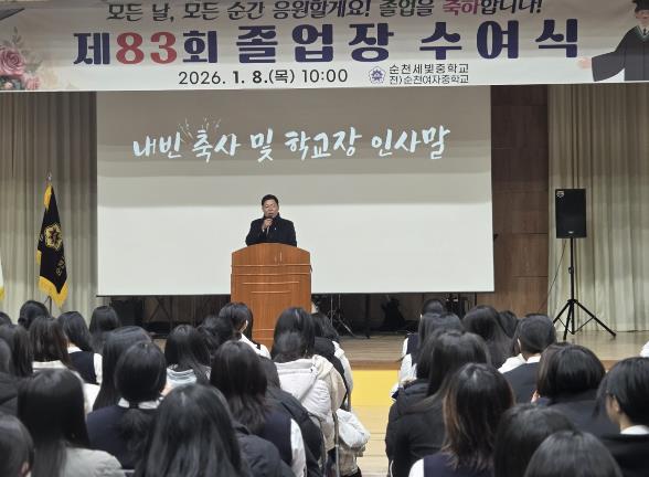 [코리아 이슈저널=홍춘표 기자] 김정희 전남도의회 교육위원장은 1월 8일, 순천세빛중학교에서 열린 제83회 졸업식에 참석해 졸업생들의 새로운 출발을 축하하고, 전남교육의 미래를 향한 따뜻한 격려의 메시지를 전했다.