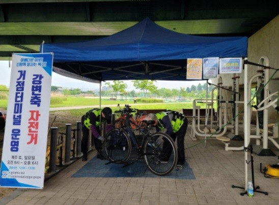 거점터미널은 교량 아래 여유 공간을 활용해 자전거 무료정비, 공영자전거 대여, 자전거길 안내 등 자전거를 이용하는 시민들에게 서비스를 제공한다.