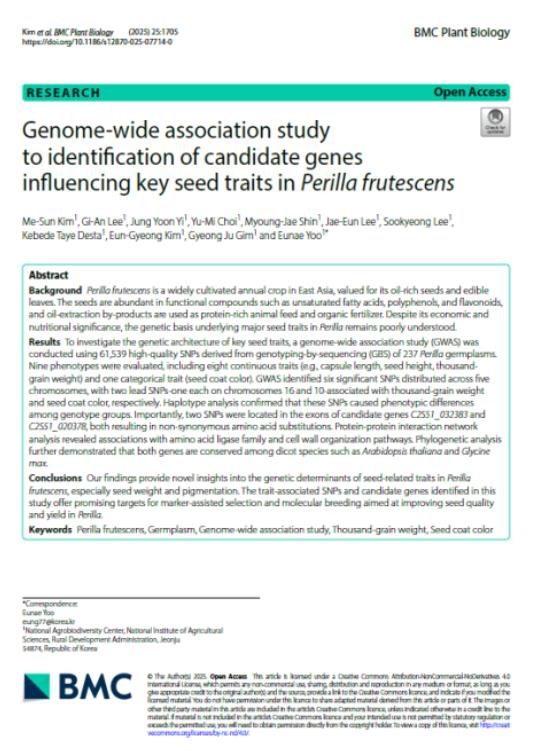이번 연구 결과는 국제학술지 ‘BMC Plant Biology’(IF 4.8)에 논문으로 게재됐다. 앞으로 고품질 들깨 품종과 기능성 자원 개발, 분자표지 개발 등에 활용될 것으로 기대된다.